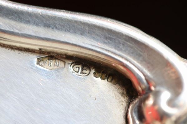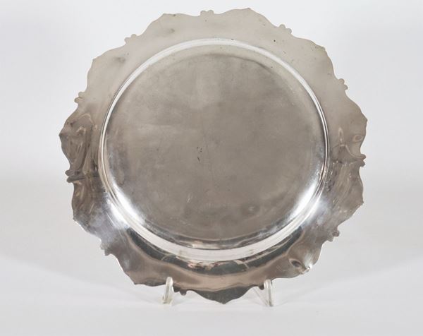 con bordo centinato cesellato e sbalzato a volute e conchiglie, diametro cm 33.