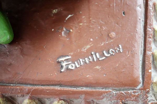 Gruppo Liberty francese "Dama sulla dormeuse" in gesso decorato e patinato. Firmato.