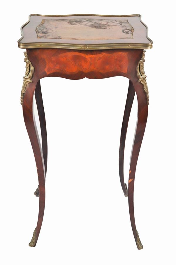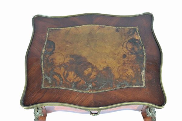 in ebano viola, radica di tuja e legno satinato con intarsi a volute geometriche e guarnizioni in bronzo dorato e cesellato. Piano in pelle danneggiato, un tiretto centrale e quattro gambe ricurve, cm 41 x 34 x 74 h.