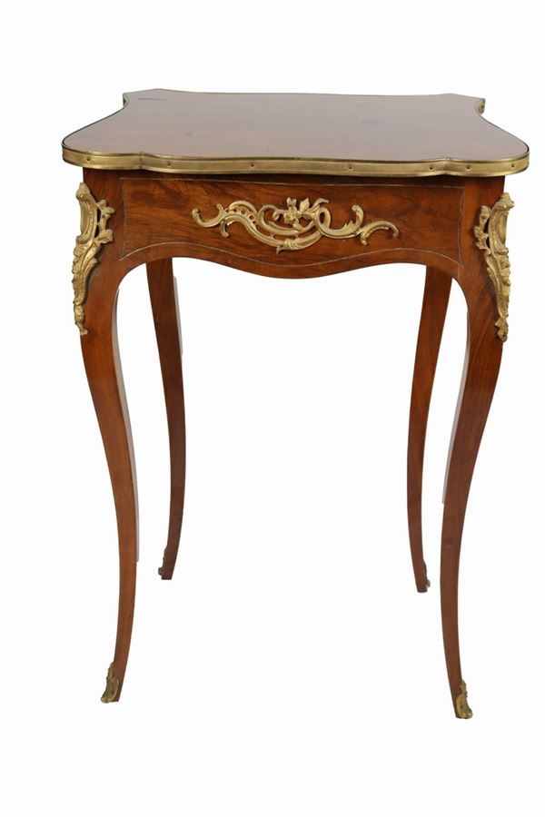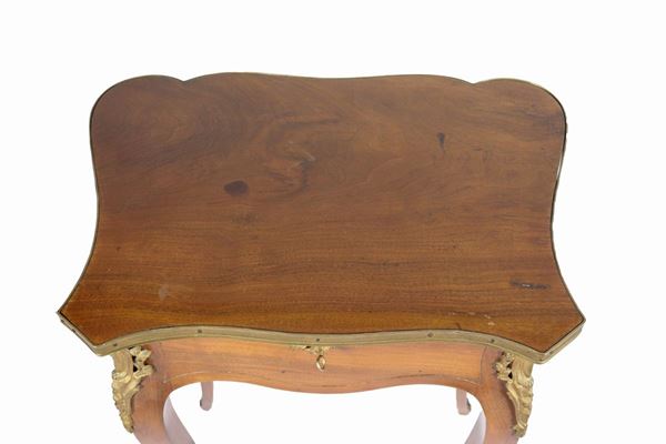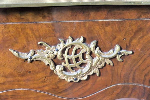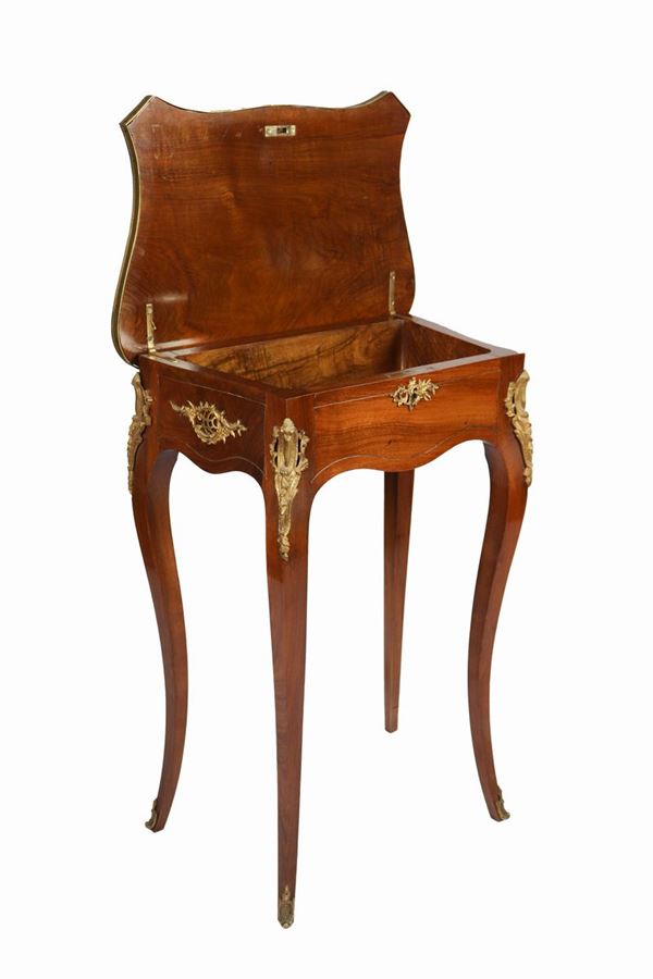 con pianetto sollevabile e scomparto all'interno, fregi e guarnizioni in bronzo dorato e cesellato e quattro gambe ricurve, cm 51 x 36 x 76 h.