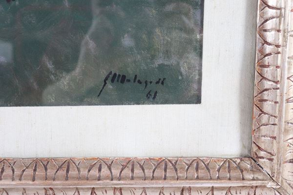 "Interno di osteria con avventori che leggono il giornale". Firmato e datato 1961. Dipinto ad olio su tela
