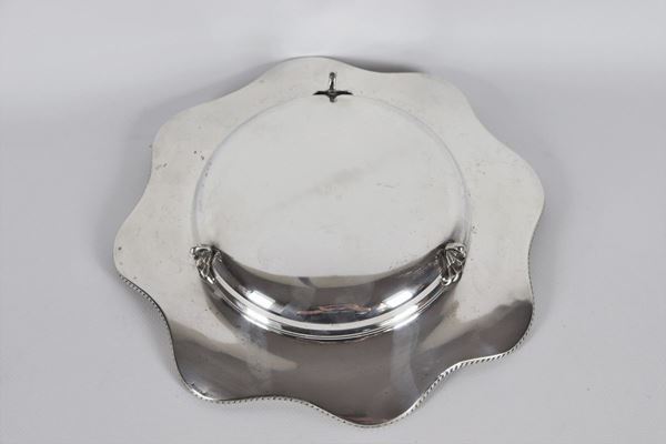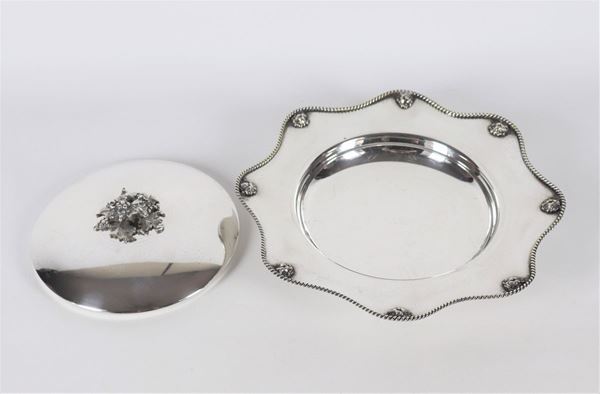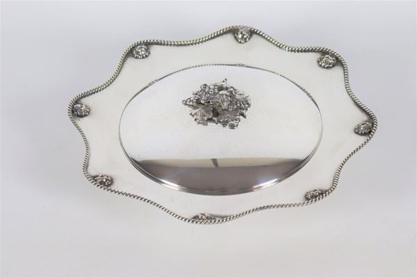 con bordo cesellato e sbalzato a motivi di cordoni e fiori, sul coperchio pomo formato da grappoli d'uva, tre piedini ricurvi. Diametro cm 27,5.