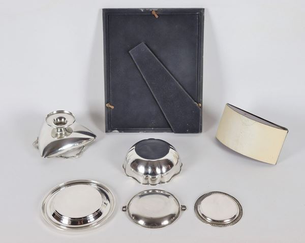 composto da: due piattini tondi, una ciotola, un posacenere, un'alzatina triangolare, un tampone per inchiostro e una cornice portaritratti. Cornice cm 20 x 25 h.