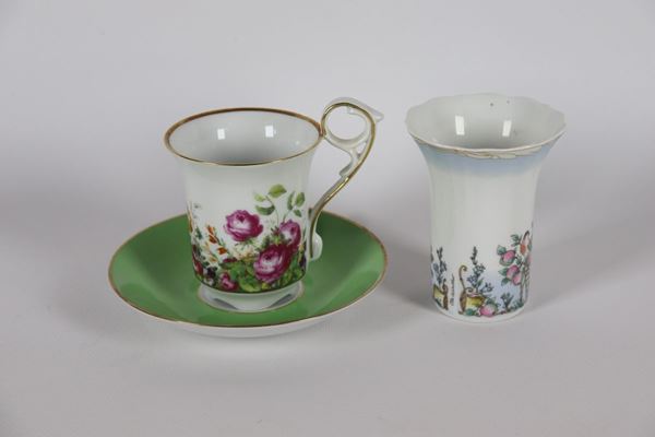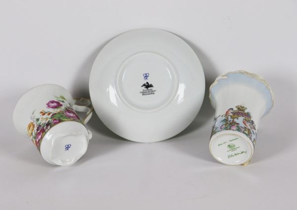 Lotto in porcellana di una tazza con piattino ed un vasetto