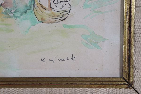 "Marina con mamma e figlioletto". Firmato. Piccolo disegno all'acquarello su carta