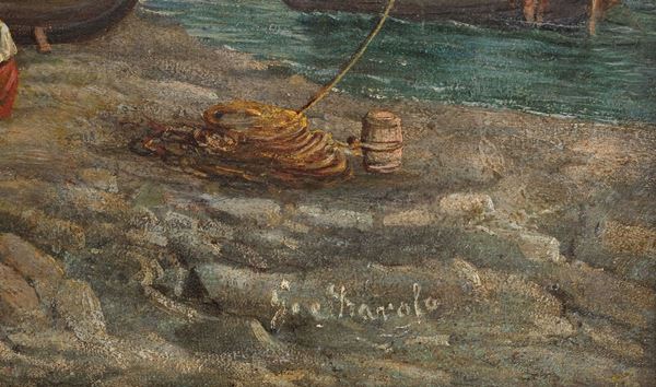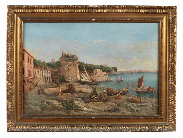"Marina con veduta di porticciolo e barche con pescatori". Firmato. Dipinto ad olio su tela