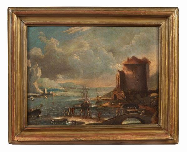 "Marina con veduta di porto, personaggi e torre" piccolo dipinto ad olio su tela