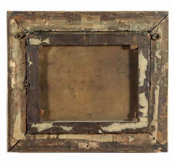 "Paesaggio con torre, ponte, pescatori e corso d'acqua" dipinto ad olio su tela
