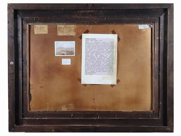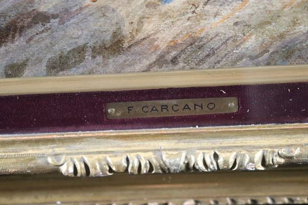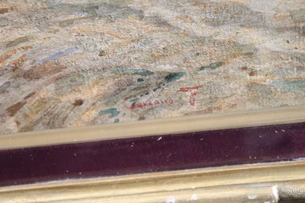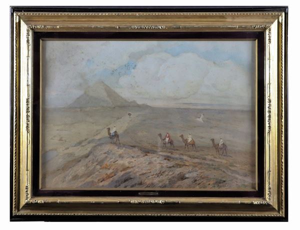 "Paesaggio egiziano con le Piramidi e la Sfinge". Firmato. Dipinto all'acquarello e olio magro