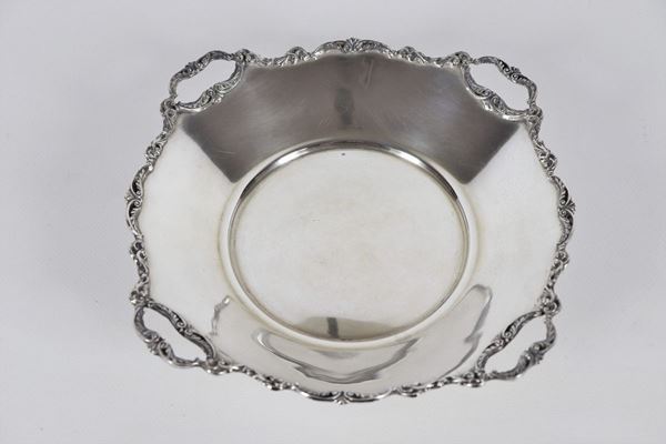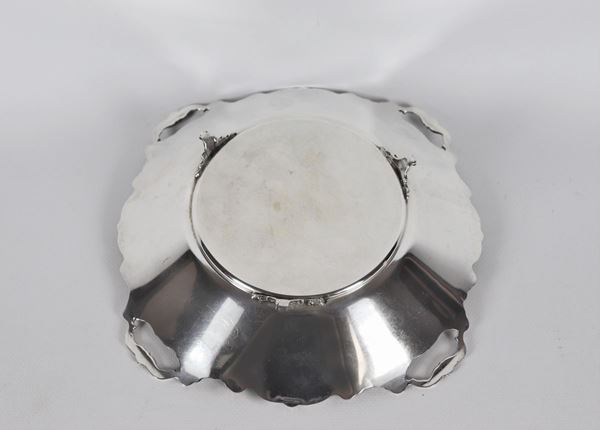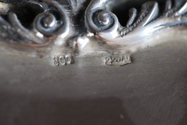 con bordo cesellato e sbalzato a volute di foglie e conchiglie, sorretta da tre piedini ricurvi. Diametro cm 27.
