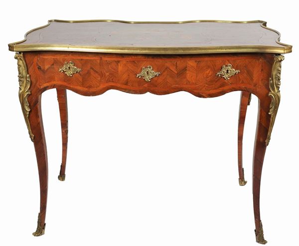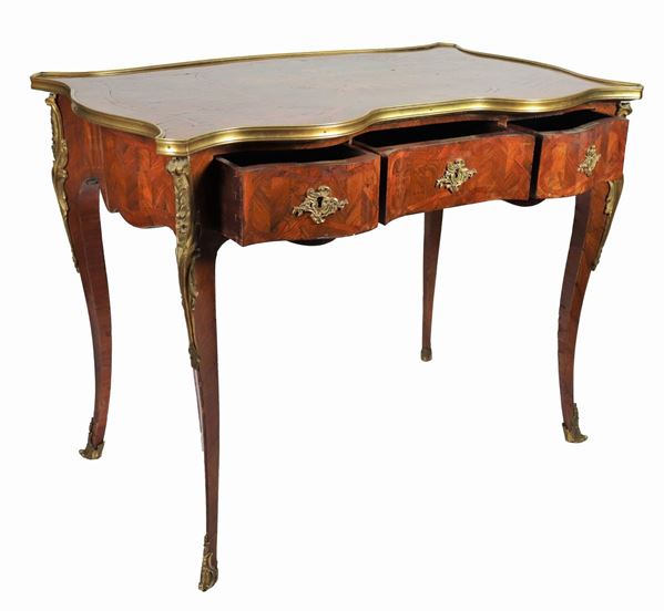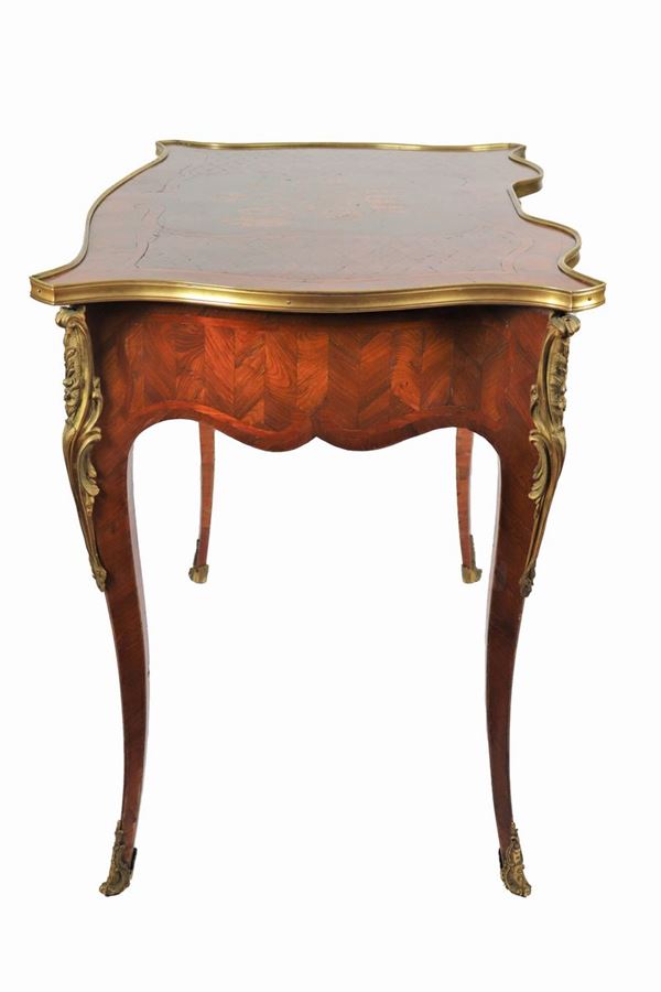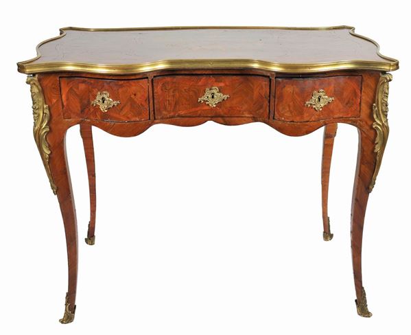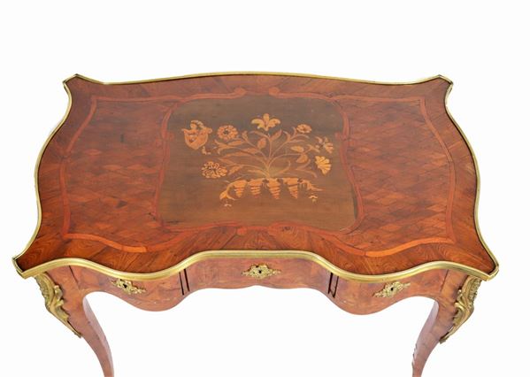 a forma rettangolare centinata con intarsi a volute geometriche e motivi floreali, fregi e guarnizioni in bronzo dorato e cesellato. Tre tiretti e quattro gambe ricurve, cm 96 x 58 x 76 h.