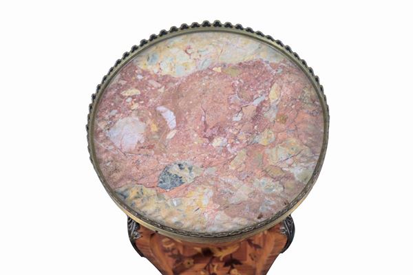 con intarsi floreali e marchetterie, pianetto in marmo con ringhierina e quattro gambe ricurve riunite da pianetto sottostante. Diametro cm 32 x 60 h.