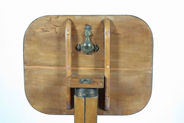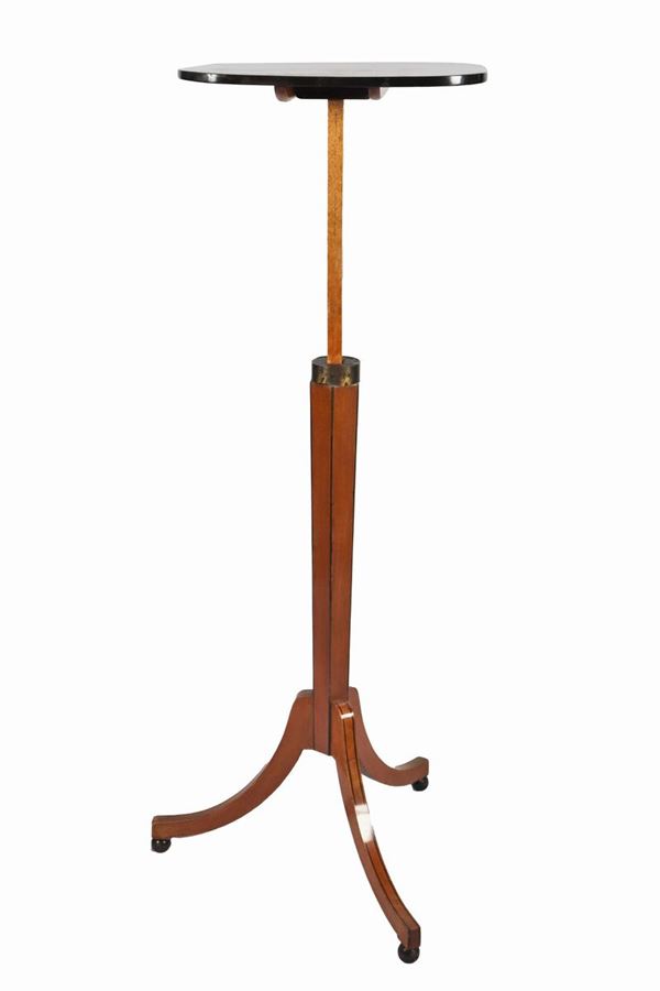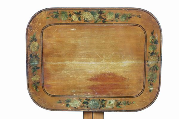 con piano dipinto a motivi di mazzetti di fiori, sorretto da colonna sfaccettata terminante con tre gambe ricurve. Il pianetto è ribaltabile e il tavolinetto si alza a telescopio, chiuso cm 35 x 28 x 76 h, alzato cm 118 h.