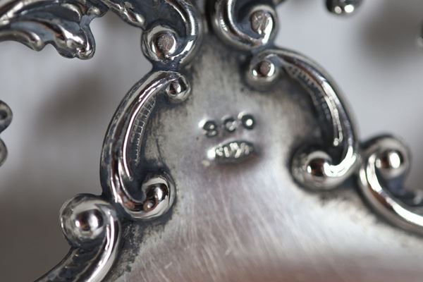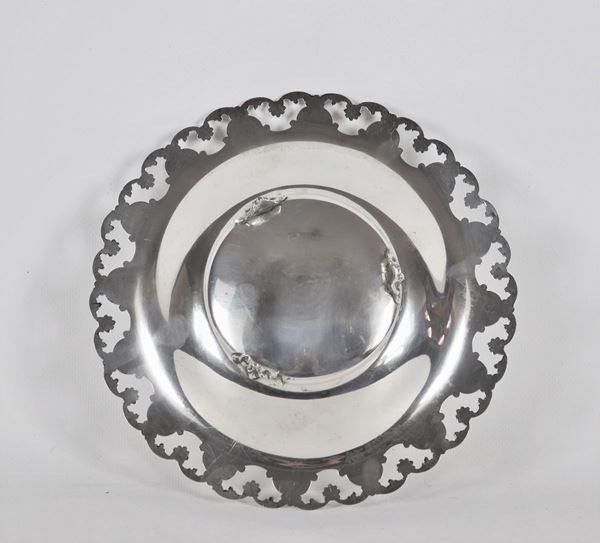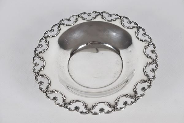 con bordo traforato, cesellato e sbalzato a motivi di volute e conchiglie, sorretto da tre piedini ricurvi. Diametro cm 20,5.