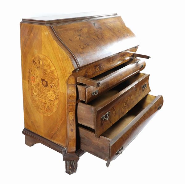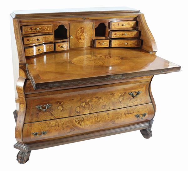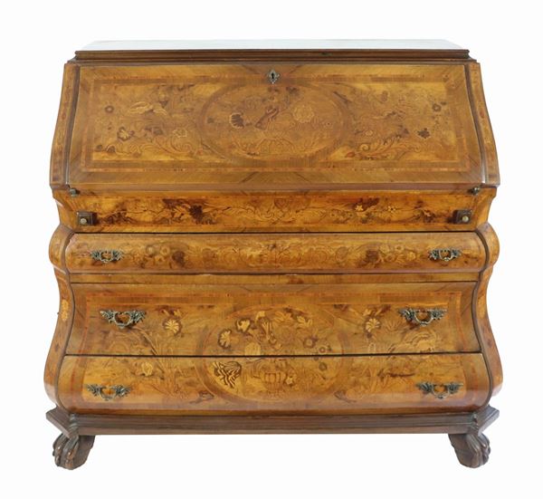Ribalta olandese di linea Luigi XV in noce, radica di noce e legni pregiati