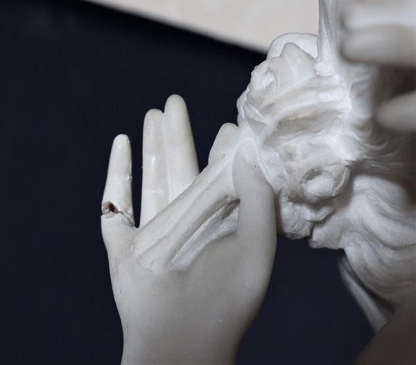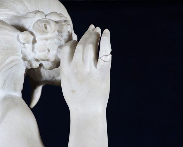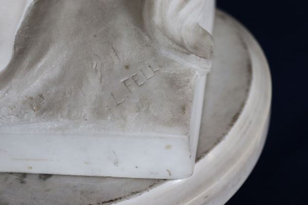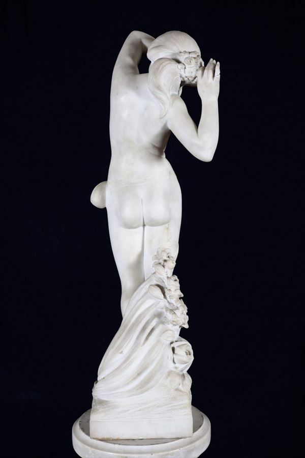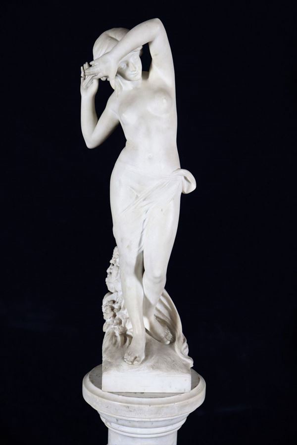 Scultura in marmo bianco "Nudo di ragazza" di gusto Art Noveau. Firmata. Colonna d'accompagno