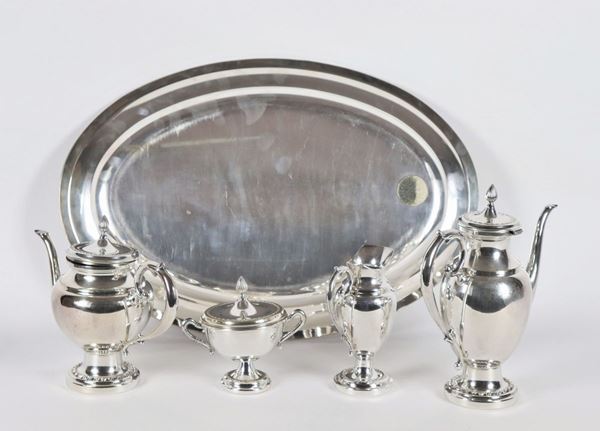 cesellato e sbalzato a motivi Impero, composto da: caffettiera, teiera, zuccheriera, lattiera e vassoio ovale. Vassoio cm 49 x 33,5.