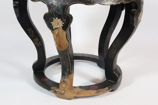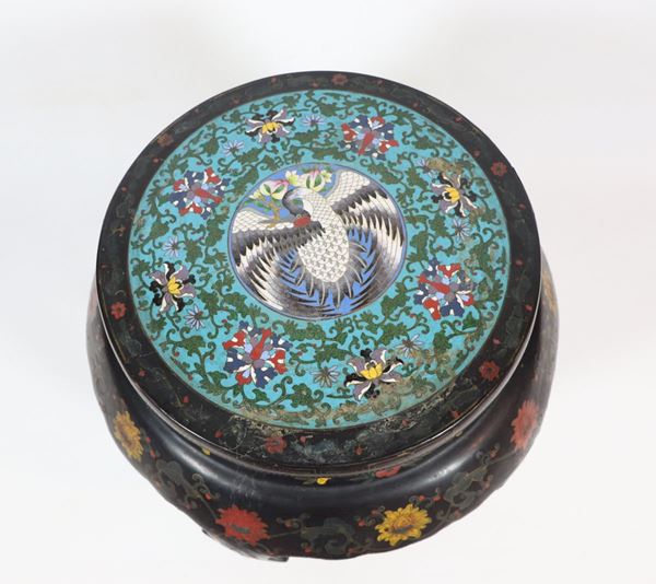 Sgabello cinese in legno laccato nero e rivestimenti in smalti policromi cloisonnè