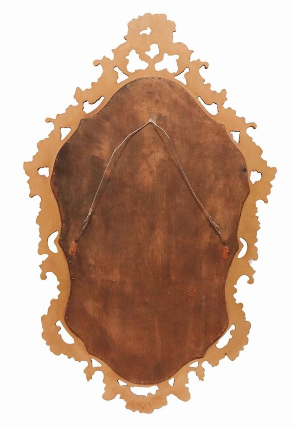 con intagli a motivi di volute e ricci, specchio molato, cm 100 x 63.