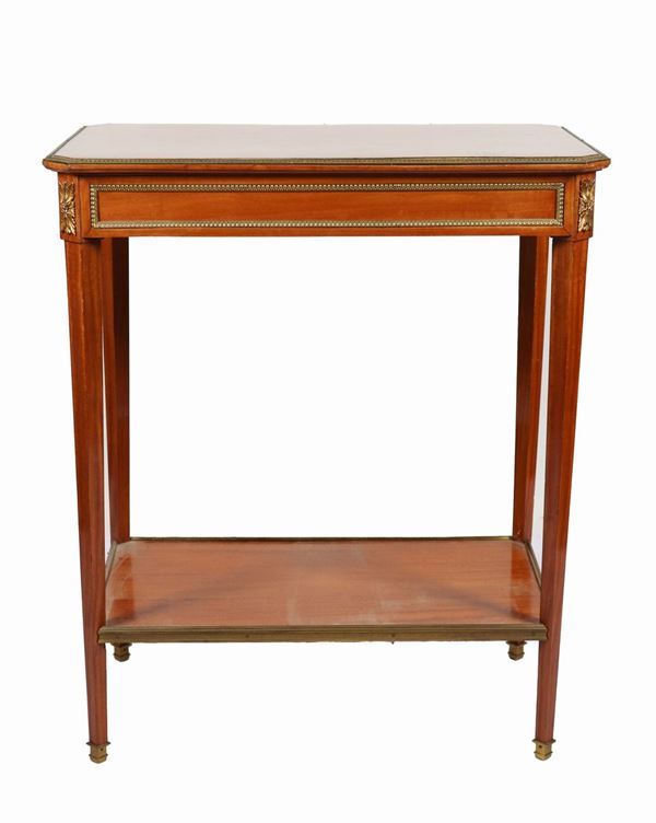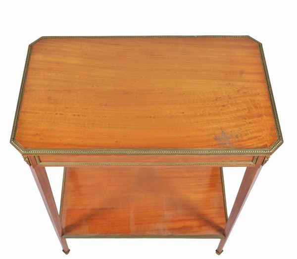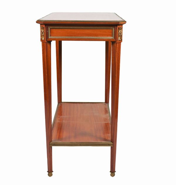 a forma rettangolare con guarnizioni e fregi in bronzo dorato e cesellato, quattro gambe a tronco di piramide rovesciata riunite da pianetto sottostante, cm 63,5 x 39 x 75 h.