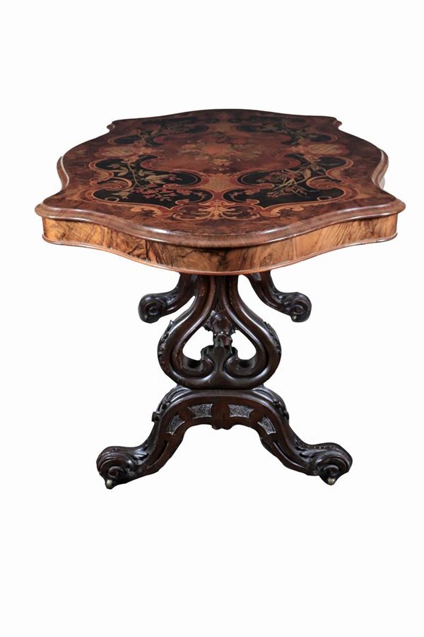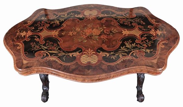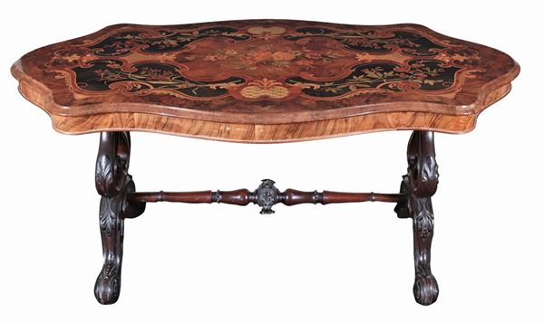 in noce, radica di noce, bois de rose e bois de fer, con piano interamente intarsiato a motivi di volute ed intrecci, fiori e mazzetti di fiori e foglie. Base intagliata a motivi di assi di coppe sorretta da quattro gambe ricurve riunite da crociera centrale tornita, cm 158 x 92 x 76 h.