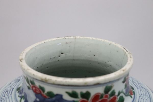 interamente decorato e variopinto con smalti a rilievo a motivi di scene di vita orientale, sul collo tre felature. Annessa basetta in teak, cm 25 x 29 h.
