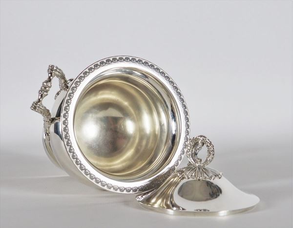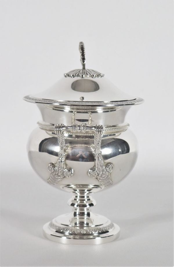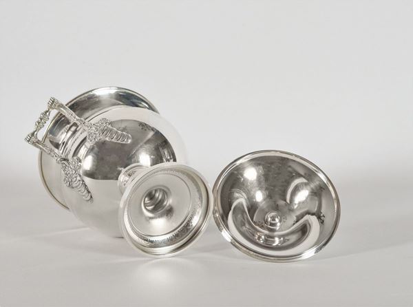 Zuccheriera a forma di coppa con manici in metallo argentato, sbalzato e cesellato a motivi Impero