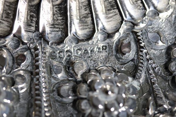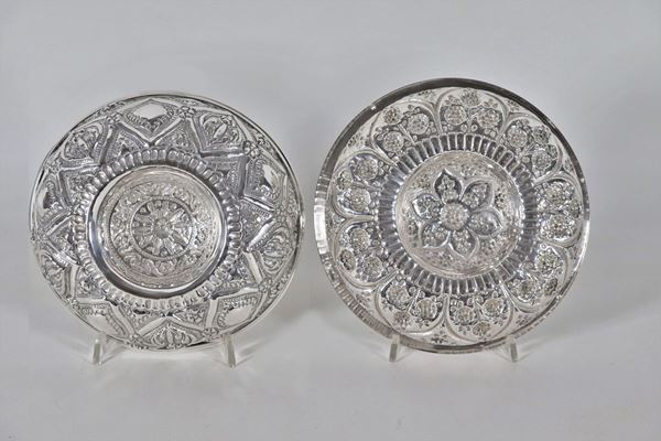 interamente cesellate e sbalzate a motivi di fiori e animali. Diametro massimo cm 19,5.