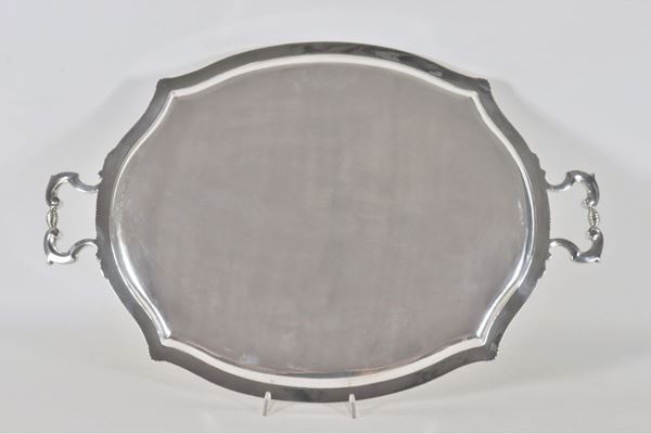 con bordi e manici cesellati e sbalzati a motivi di conchiglie e baccellature, cm 69 x 45,5.