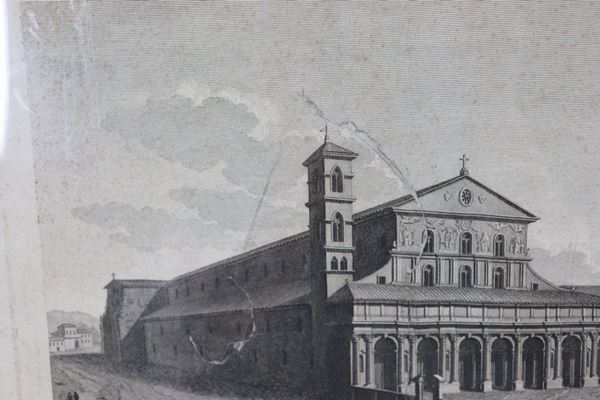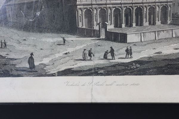 Lotto di due antiche piccole stampe "Corteo papale a Piazza del Popolo e la Basilica di San Paolo"
