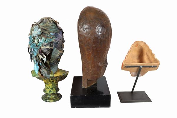 "Onda marina" in legno firmata Carlo Alberto Cortina di Favria; "Volto di donna" in terracotta decorata e smaltata, montata su base in ferro; "Busto di ragazza" in gesso decorato e cartapesta. Lievi difetti. Altezza massima cm. 81.