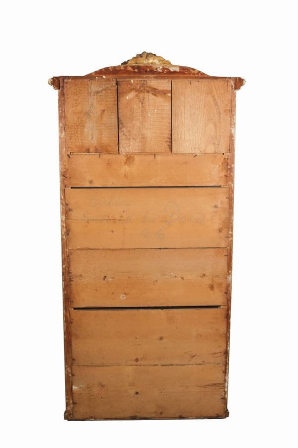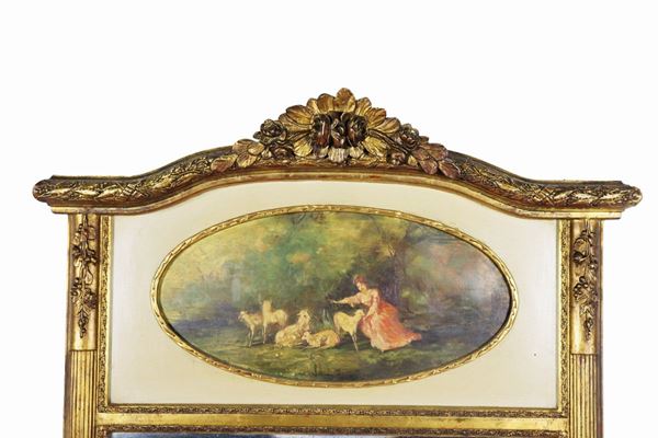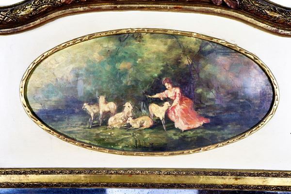 intagliato a motivi Luigi XVI, sulla cimasa piccolo dipinto ovale "Scena pastorale", cm 85 x 172 h.