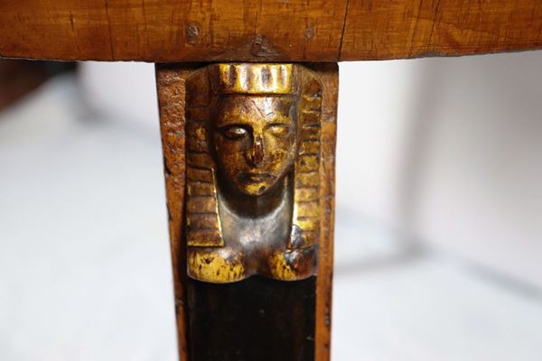 con quattro gambe sormontate da teste di sfingi. Mancante delle prolunghe, tavolo chiuso diametro cm 108 x 76 h, apertura massima cm 260.