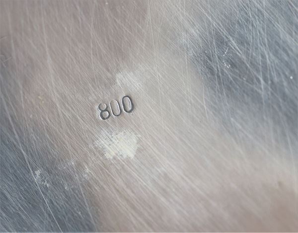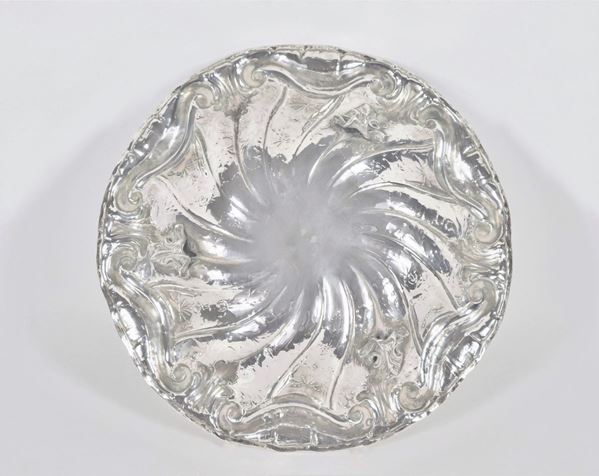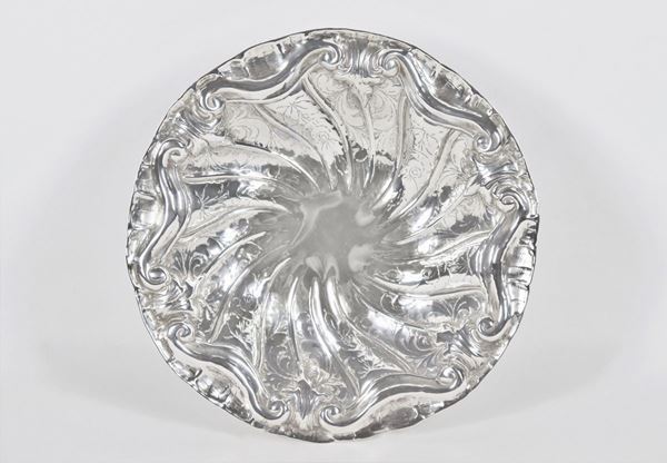cesellata a rilievo a volute floreali, sorretta da tre piedini ricurvi. Diametro cm 27 x 5 h.