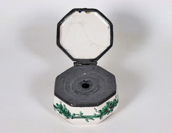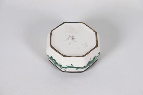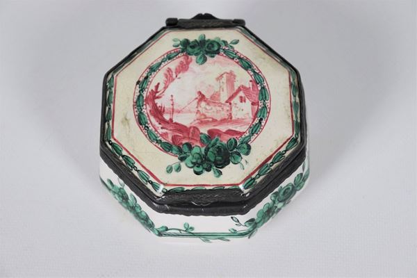 variopinto a motivi di paesaggio e ghirlande floreali. Il coperchio presenta difetti con incrinature, cm 10 x 11 x 6 h.