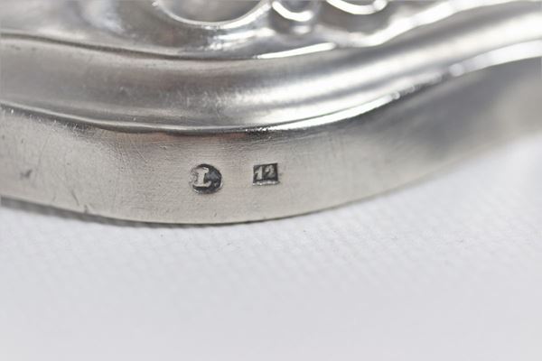 cesellato a motivi di torchon Luigi XV, gr. 250. Base cm 15,5 x 14 x 23 h.
