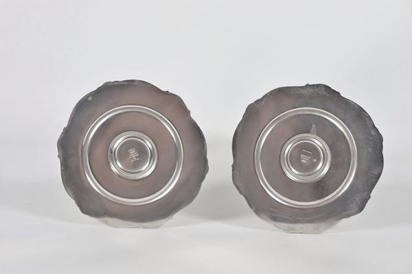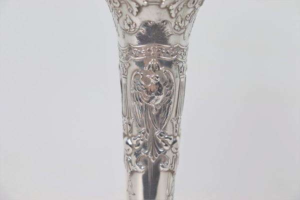 interamente sbalzati e cesellati a motivi di volute, ghirlande floreali ed aquile. Diametro della base cm 14,5, altezza cm 30 ciascuno.