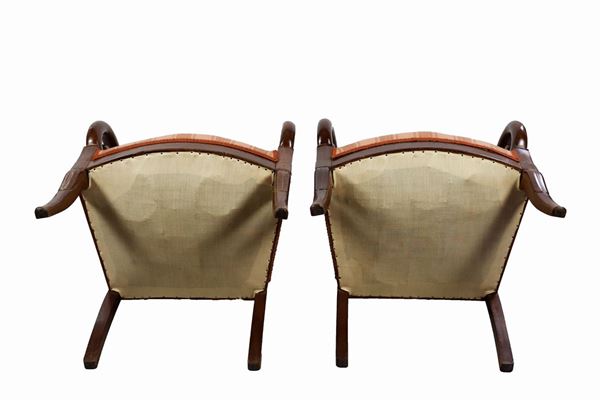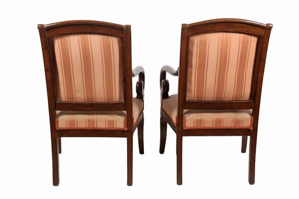 con braccioli ricurvi e quattro gambe a sciabola, copertura in tessuto rigato, cm 57 x 47 x 92 h ciascuna.