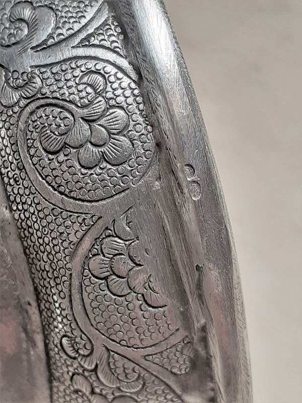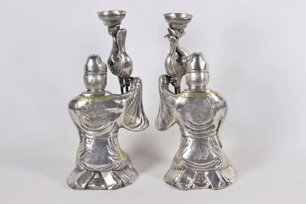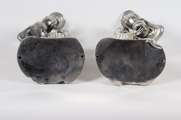 cesellate e sbalzate con figure di uccelli esotici. Lievi ammaccature, cm 11 x 20 x 37 h ciascuna. Gr. 3870.