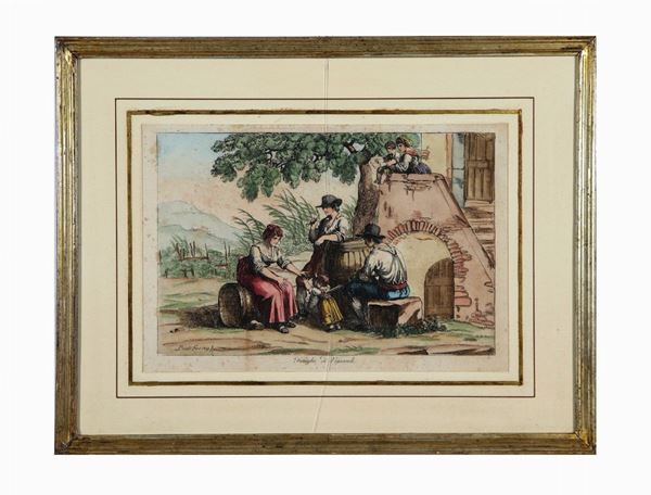 Coppia di stampe acquarellate a soggetti pinelliani "Famiglia di vignaroli" e "Costumi di Nettuno"