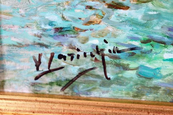 Firmato. "Scogliera a Capri con barche di pescatori" dipinto ad olio su tela