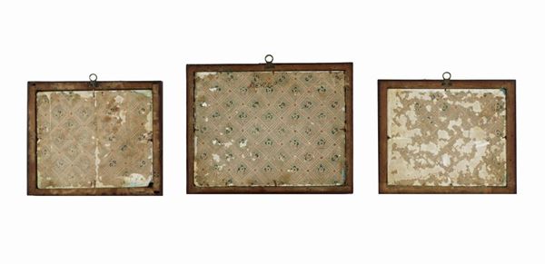 applicati su placche decorate in azzurro con cornici in noce, di cui una mancante del vetro. Misure differenti, le due più piccole cm 17 x 20 ciascuna, la più grande cm 20 x 26. La placca più grande presenta difetto ad un angolo.