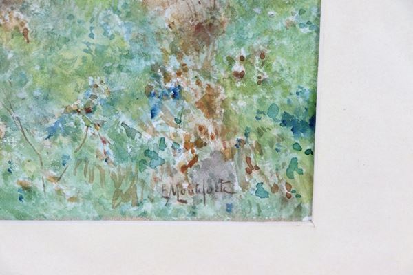 Firmato. "Paesaggio con pastore e gregge di pecore" dipinto all'acquarello su carta