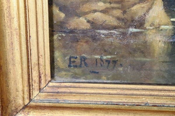 Siglato E. R. e datato 1877. "Scena di combattimento" dipinto ad olio su tela