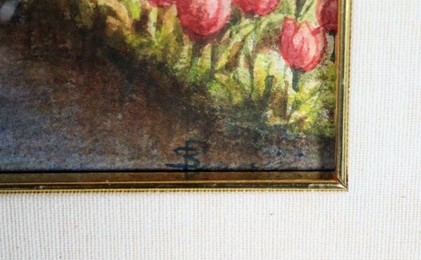 Firmato. "Prati di tulipani fioriti con fiume e case contadine" acquarello su carta