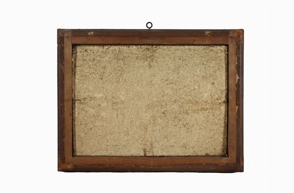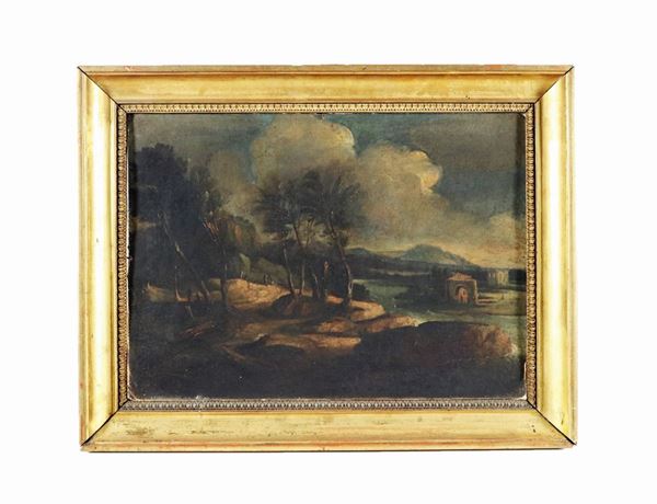 "Paesaggio laziale con ruderi, corso d'acqua e viandanti", dipinto ad olio su tela applicata a cartone