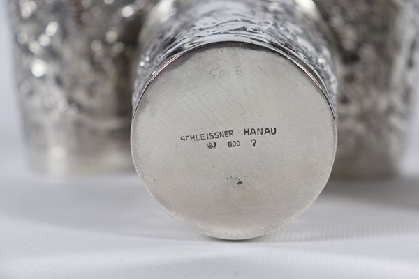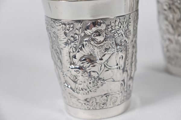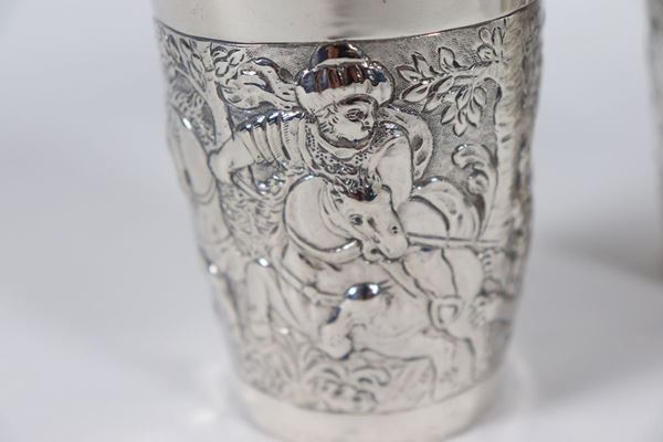 interamente cesellati a rilievo con scene di caccia, altezza cm 10 ciascuno. Gr. 460.