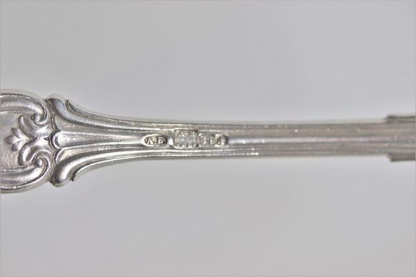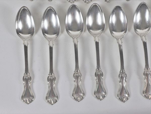 cesellato e sbalzato, composto da: 6 cucchiai grandi, 6 forchette grandi, 6 coltelli grandi e 6 piccoli cucchiai da dolce. Gr. 1730 netti.