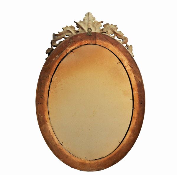 con cimasa intagliata a motivi di volute di foglie e fiori, specchio molato, cm 93 x 60.
