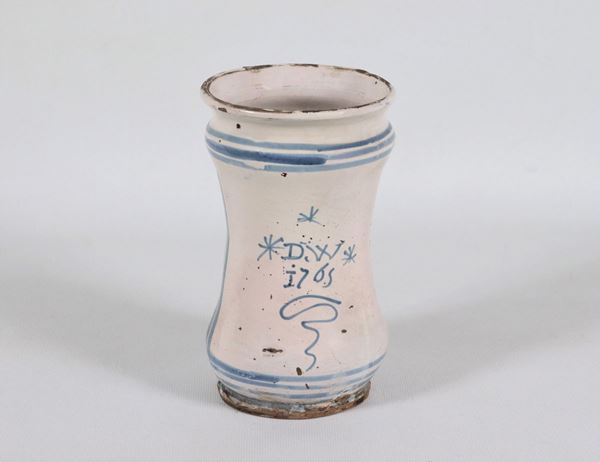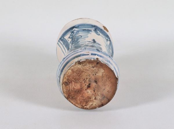 Albarello da farmacia in maiolica smaltata con decorazioni dipinte in blu a motivo di paesaggio, difetti